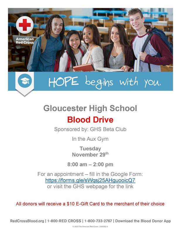 GHS Beta Club will be sponsoring a Red Cross blood drive on Tuesday, 29 November, in the Aux Gym, and we need your help! Can you spare some blood to save lives? GCPS Staff, and Students age 16 and up, can sign up for an appointment through the Google Form: https://forms.gle/sWqsj25AHguooicQ7