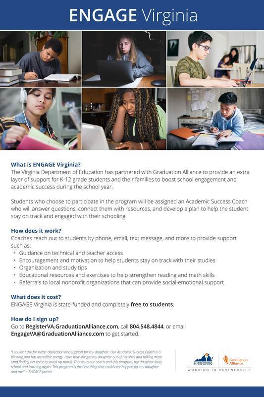 We’re excited to make you aware of a free program, ENGAGE Virginia, that will provide students with an extra layer of academic support this school year. The Virginia Department of Education has partnered with Graduation Alliance to provide support for students and their families to boost school engagement and academic success during the school year, and GCPS has elected to take advantage of this partnership opportunity.